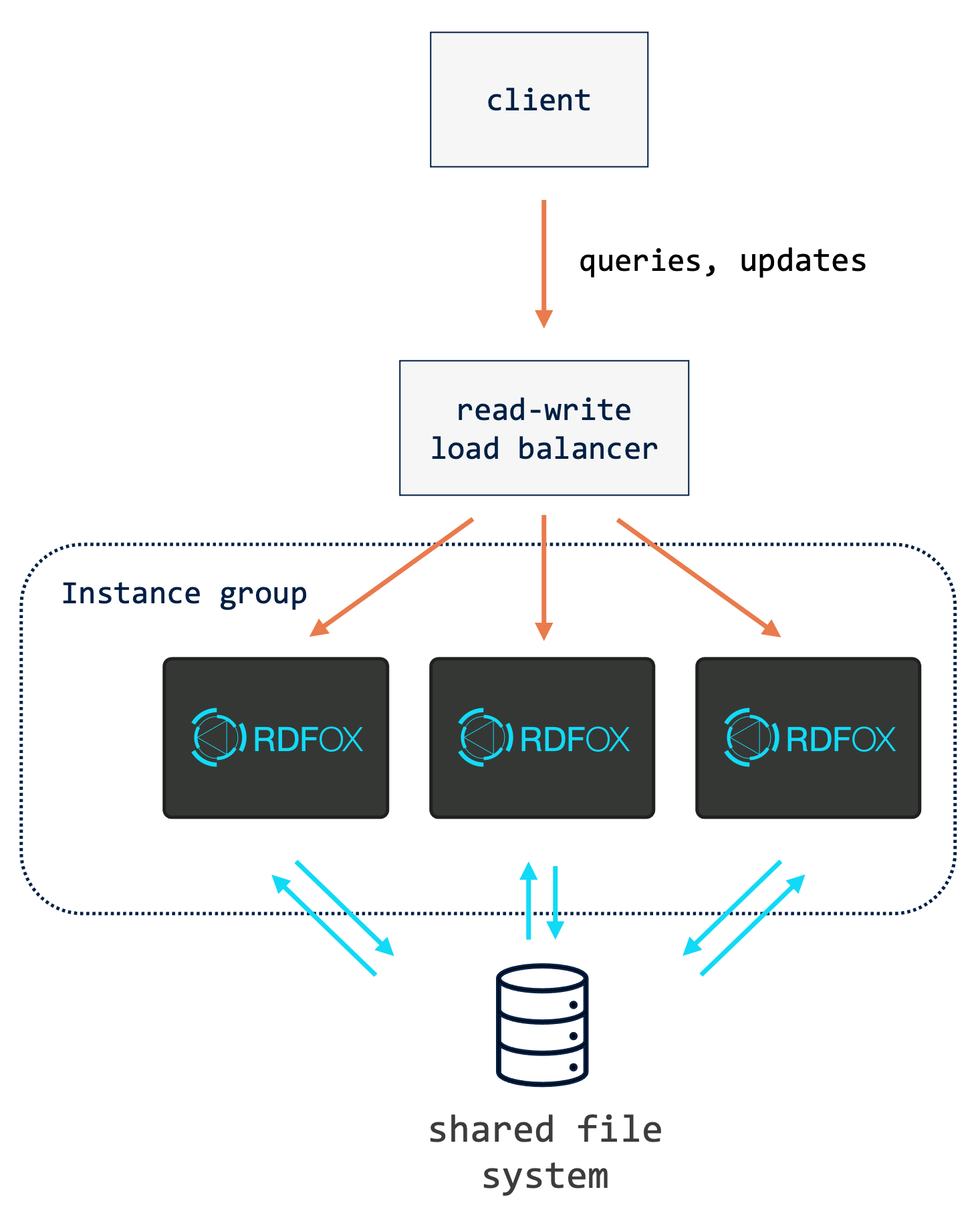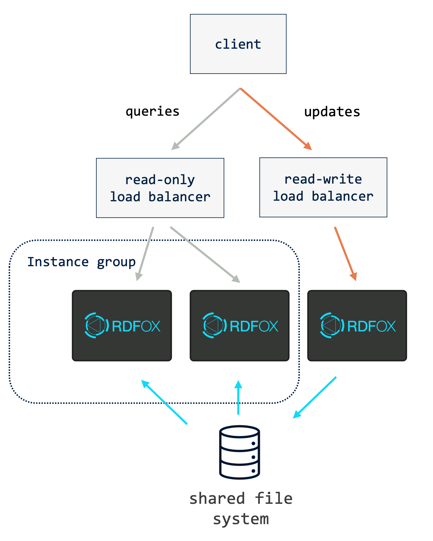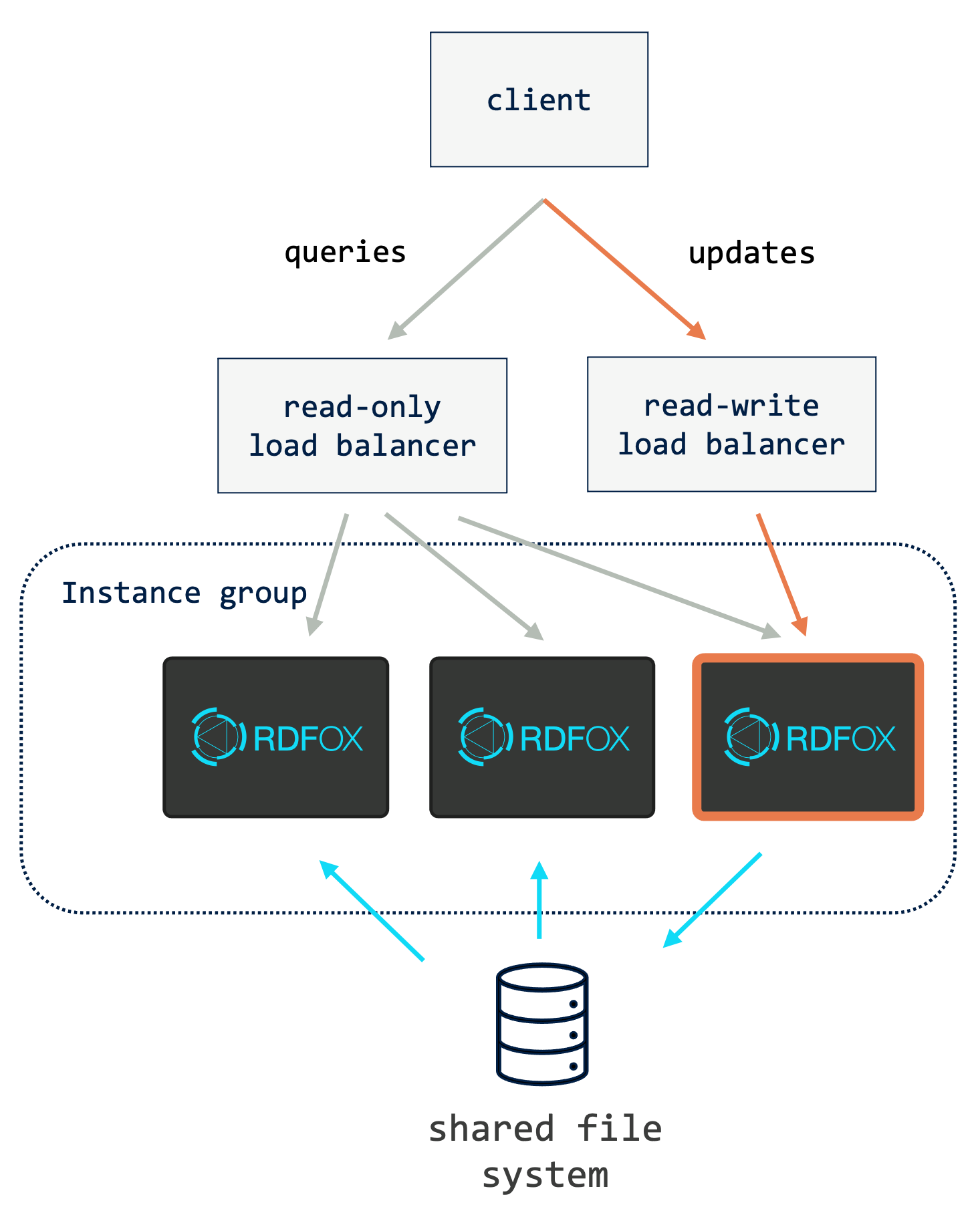 The following sections make some assumptions about the infrastructure used for the RDFox HA deployment. First, it is assumed that, where a group of instances is used, there is some system responsible for ensuring that the group contains the desired number of healthy instances at all times, with the capability to start new instances when this is not the case. This could be done manually but will most often be autonomous. Second, it is assumed that the load balancer can be configured to route traffic to the healthy instances within such groups. Kubernetes is an example of a system that meets these criteria.